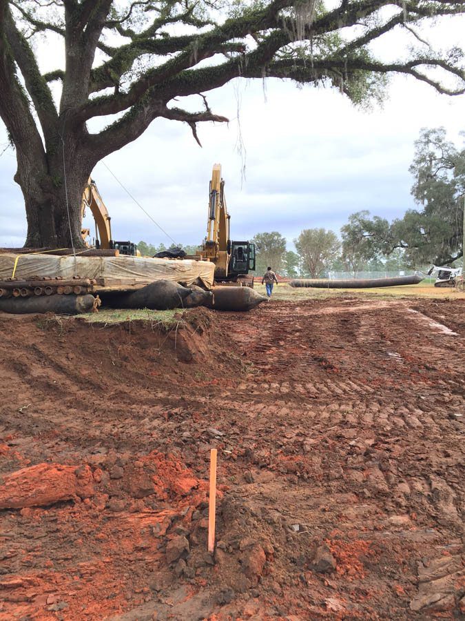 In deep south Georgia, there are many 10,000-60,000 acre hunting reserves commonly called “Plantations.” An EDI client from 1999, who we moved several large trees of multiple species for in Duchess County, New York, contacted us to move five 200+-year-old live oaks at his newly acquired Four Oaks Plantation. After a fall root-pruning, these 36-48” diameter live oaks were moved the following spring, traversing nearly a mile from harvest to final locations. The trees were given names as staff and management grew to love these specimens. Today, Melissa, Javier, Pete, Re-Pete, and Fred are thriving.