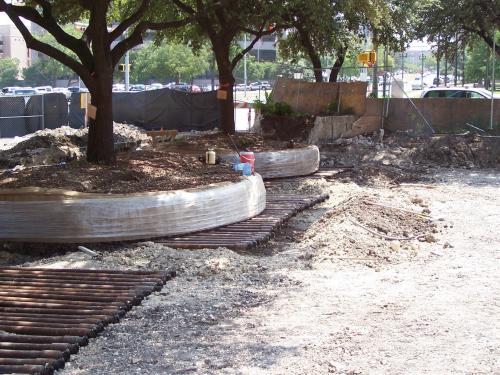 The architect’s vision of the project called for the utilization of existing oaks trees to shade a pedestrian area and the creation of a Cedar Elm grove between the two buildings.